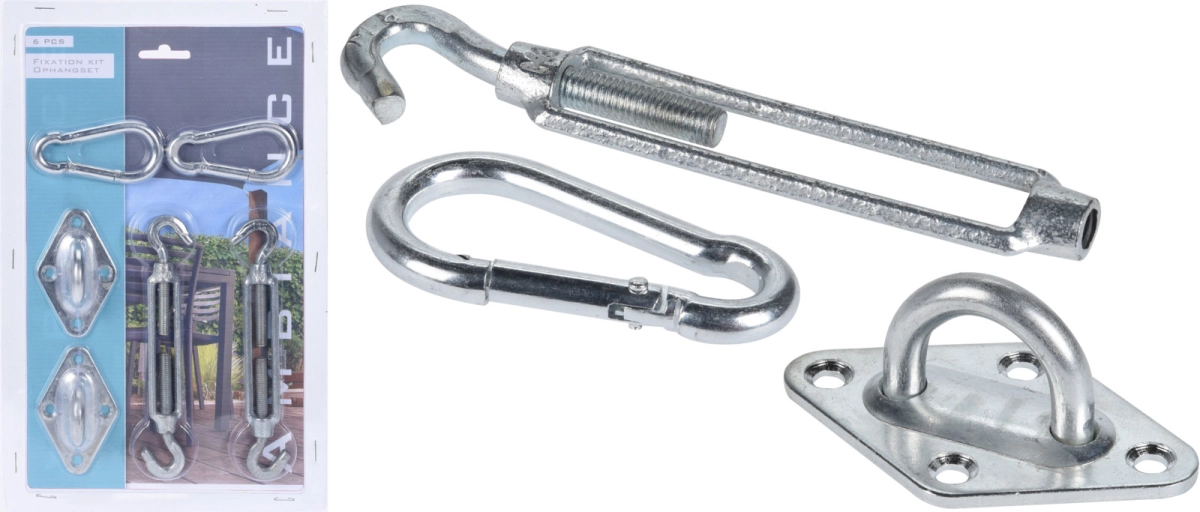 - Compleet setje – twee metalen karabijnhaken, twee metalen ogen op plaat en twee metalen spanwartels