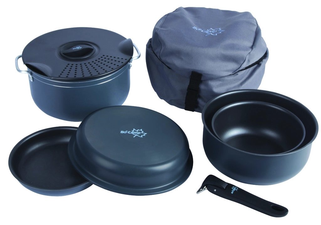 De Bo-Camp pannenset Camping is een stijlvolle en zeer compacte 7-delige pannenset. Deze complete lichtgewicht set bestaat uit: 3 kookpannen, 2 koekenpannen, 1 afgietdeksel en 1 pannengreep. Alle pannen uit de pannenset Camping hebben een poedercoating aan de buitenkant en een anti-aanbaklaag aan de binnenkant. In de meegeleverde luxe beschermhoes kunnen alle delen zeer compact worden opgeborgen. Te gebruiken op de warmtebronnen gas, keramisch en elektrisch.