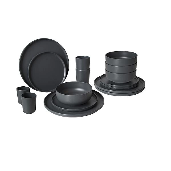 Dit 16-delige Patom servies van Bo-Camp heeft een opstaande rand en een modern donker uiterlijk. De set is gemaakt van 100% melamine, waardoor het lichtgewicht, vrijwel onbreekbaar, krasweren en vaatwasmachinebestendig is. Het Patom servies is daarnaast food approved, omdat het BPA vrij is. Deze set bestaat uit 4 dinerborden, 4 ontbijtborden, 4 kommen en 4 mokken. De Bo-Camp Patom serviesset is geschikt voor hitte tot 85°C.
