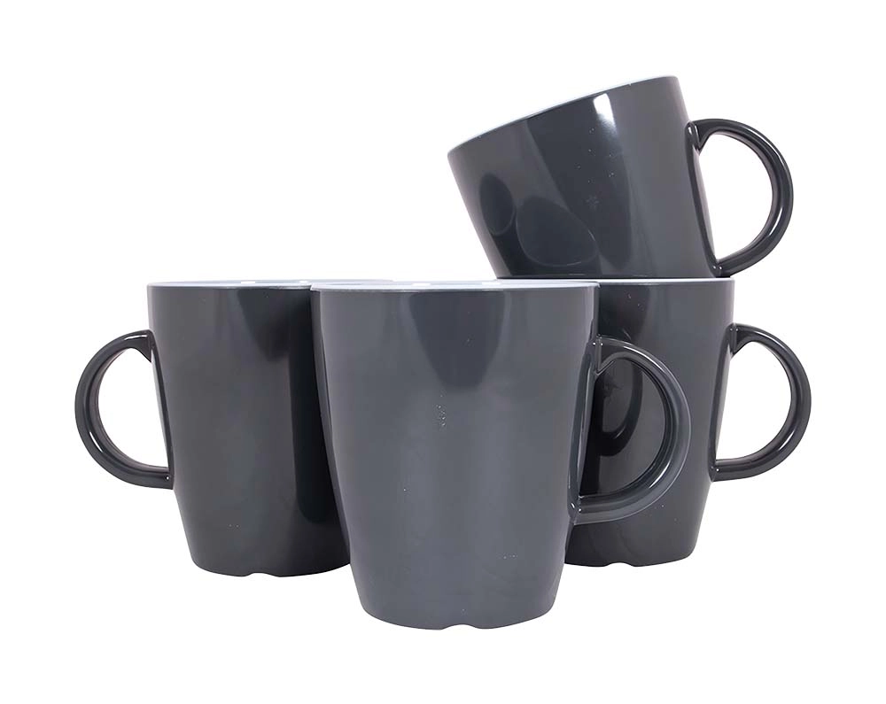 Gimex Vivid-line mok in een stijlvolle grijze kleur. De mok is gemaakt van 100% melamine van hoge kwaliteit, kraswerend en bijna onbreekbaar. De mokken worden geleverd in een set van 4 en hebben een inhoud van 380ml.