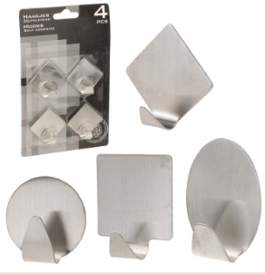 Een set van 4 zelfklevende ophanghaakjes. De ophanghaakjes zijn gemaakt van RVS. De haakjes zijn leverbaar in 4 verschillende uitvoeringen: Vierkant, Ruit, Cirkel en Ovaal. De ophanghaakjes worden geleverd per setje van 4 dezelfde haakjes.