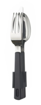 De Rosti Mepal bestekset bestaat uit een vork, mes en lepel. Een clip houdt dit driedelige kampeerbestek netjes bij elkaar. Super handig!