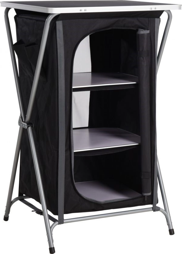Deze opvouwbare campingkast is stevig, maar ook lichtgewicht door het aluminium frame. De kast beschikt over drie opbergvakken met een inlegblad voor extra stabiliteit en stevigheid. Aan de zijkant heeft de kast nog extra opbergvakken en ook bovenop het tafelblad kunt u spullen kwijt. U vervoert de kast eenvoudig en compact in de bijgeleverde opbergtas.