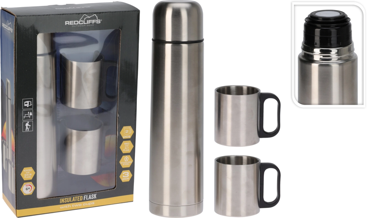 De Redcliffs thermosfles met twee bijpassende bekers is perfect voor het behoud van de temperatuur van je drankjes, zowel warm als koud. Ideaal voor onderweg, zoals tijdens lange reizen, wandelingen of kampeertrips. Dankzij de veiligheidsdop is de thermosfles luchtdicht en lekvrij, zodat je zonder zorgen kunt reizen. De dubbelwandige bekers, gemaakt van roestvrij staal, hebben een inhoud van 180 ml en zijn perfect voor onderweg.