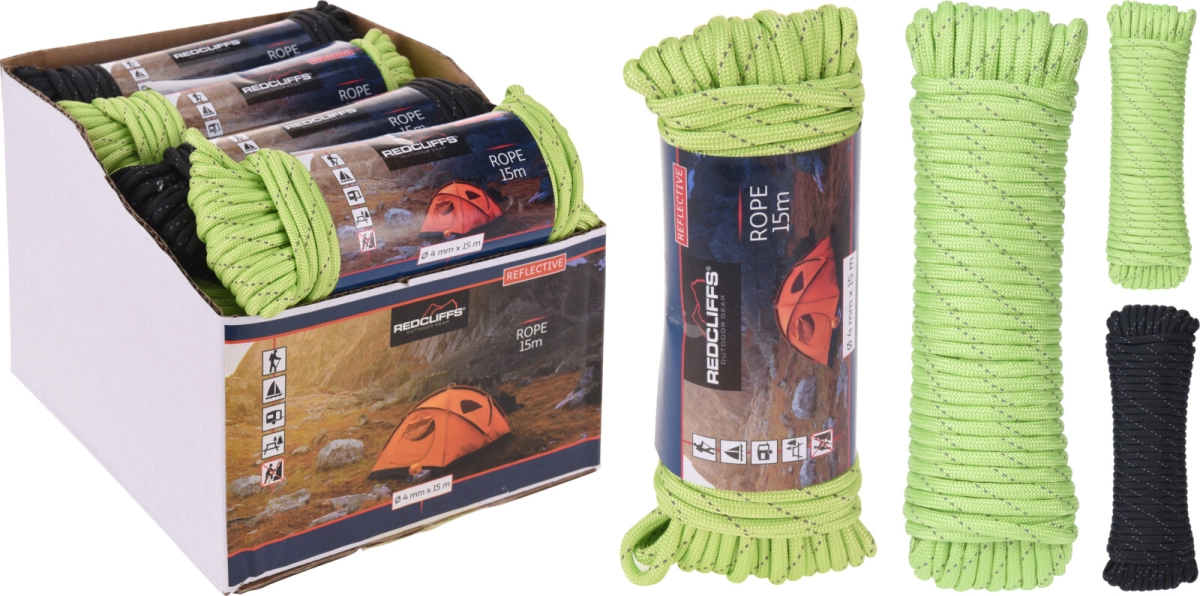 Met deze reflecterende scheerlijnen valt u nooit meer in het donker over uw scheerlijnen. De rol is 15 m lang en heeft een diameter van 0,4 cm. Zo staat uw tent dus stevig en kunt u nog zien waar de lijnen zitten.