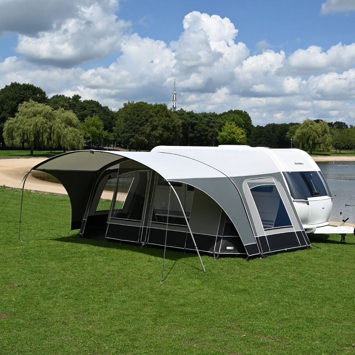 Met de optionele dakluifel breid je de Unico Bologna voortent eenvoudig uit tot een royale schaduwplek van 220 cm diep. Dankzij de stevige spiraalritssluiting is de luifel snel en betrouwbaar te bevestigen. De ronde vorm zorgt voor een perfecte afwatering, terwijl de ventilatiemogelijkheden van de voortent volledig behouden blijven. Met de stabiele boogstokconstructie en meegeleverde accessoires geniet je van een ruime, middenstaander-vrije overspanning die comfort en gemak biedt tijdens iedere kampeervakantie.Belangrijkste kenmerken: