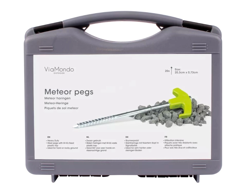 Met de Via Mondo Meteor haringen blijven tenten en luifels stevig staan op moeilijke, rotsige, kiezelige grond. De haringen zijn voorzien van een kunststof clip en een stalen 7,3 mm dikke pen. Door de draaiende ribbels aan de grondpen blijft de haring stevig zitten. De haringen worden per 20 stuks geleverd in een stevige opberg/transportkoffer.