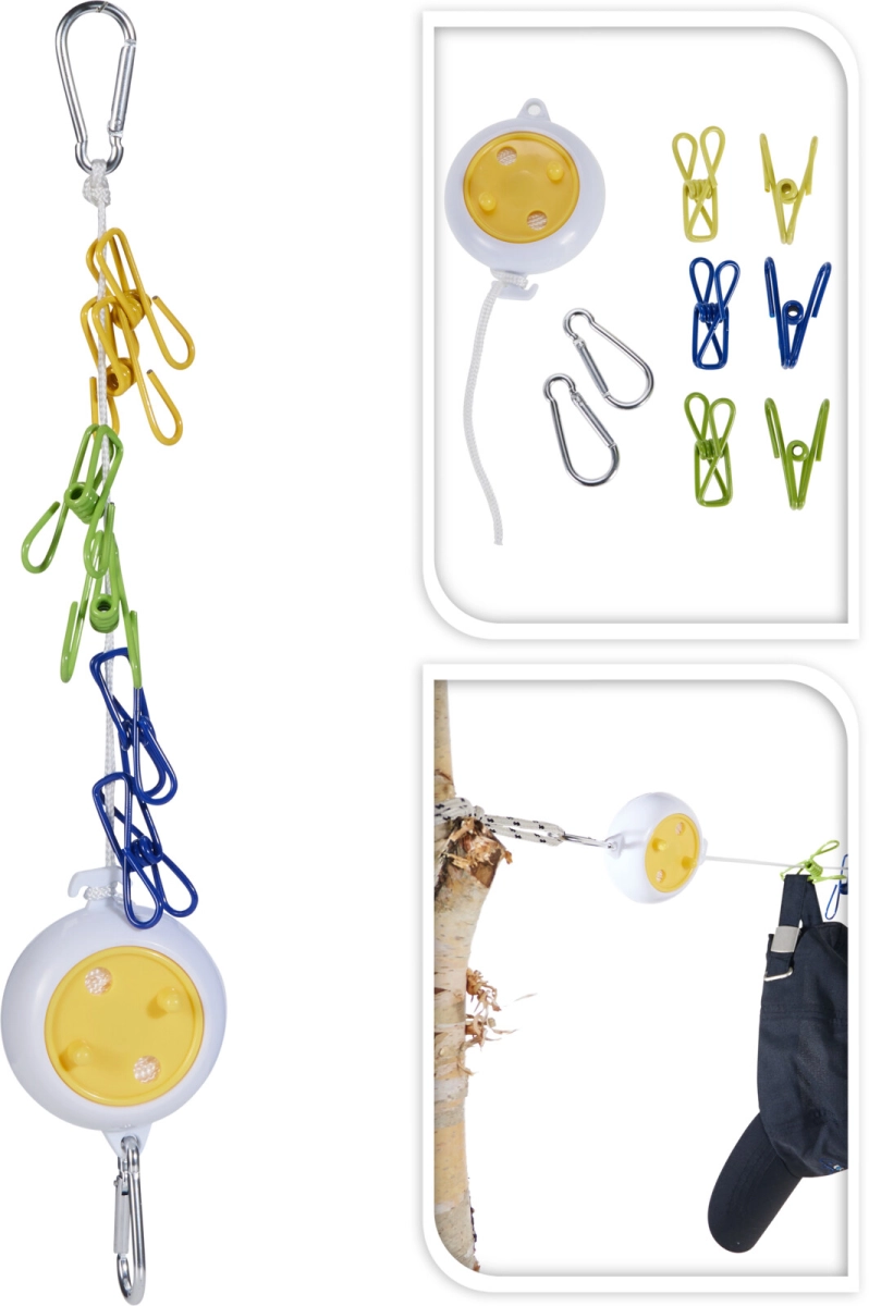 De Redcliffs uittrekbare waslijn is ideaal voor zowel thuisgebruik als op de camping. Het slimme uittrekbare ontwerp maakt het mogelijk om zelf de lengte te bepalen, tot maximaal 8 meter. Dankzij de 6 stevige klemmen hang je kleding en handdoeken eenvoudig en veilig op. Door het compacte formaat van Ø 8 × 4,5 cm neem je de waslijn overal mee en berg je hem gemakkelijk op.Belangrijkste kenmerken